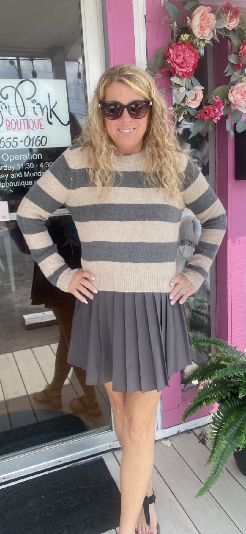 This grey pleated tennis skirt boasts a trendy design and is equipped with built-in shorts for added convenience and coverage. Perfect for sports and everyday wear, this skirt offers both style and functionality.