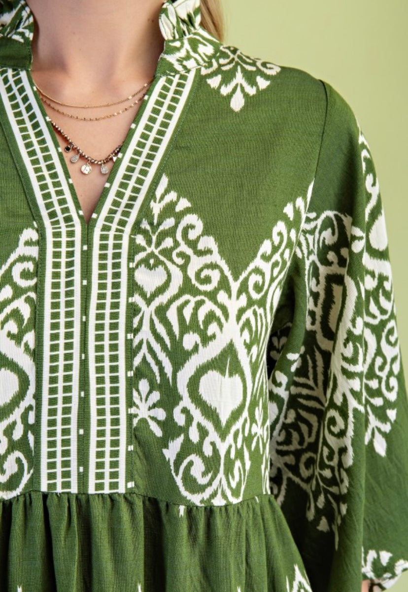 Unleash your inner fashionista with our Olive Printed Tiered Dress! This trendy dress features 3/4 length bell sleeves and a beautiful fall print. Perfect for any occasion, this dress will have you turning heads and feeling confident all day long!