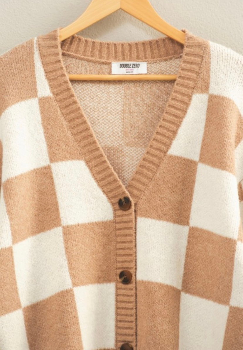 This cozy cardigan sweater features a bold checkered pattern complemented by a relaxed silhouette and chunky button details, perfect for versatile styling. Pair it with slacks for a refined look or denim for casual days. Ideal for transition weather or layering over your favorite blouse.